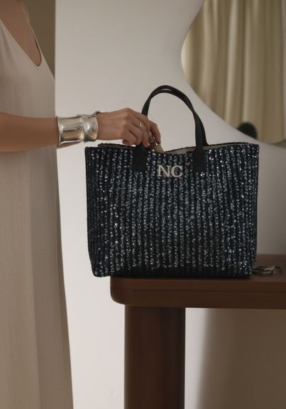 Bolso shopper NOCO diseñado en tejido vaquero denim con incrustaciones cosidas de lentejuelas, un material sofisticado y muy especial que aporta brillo y elegancia sin perder el carácter urbano del denim.